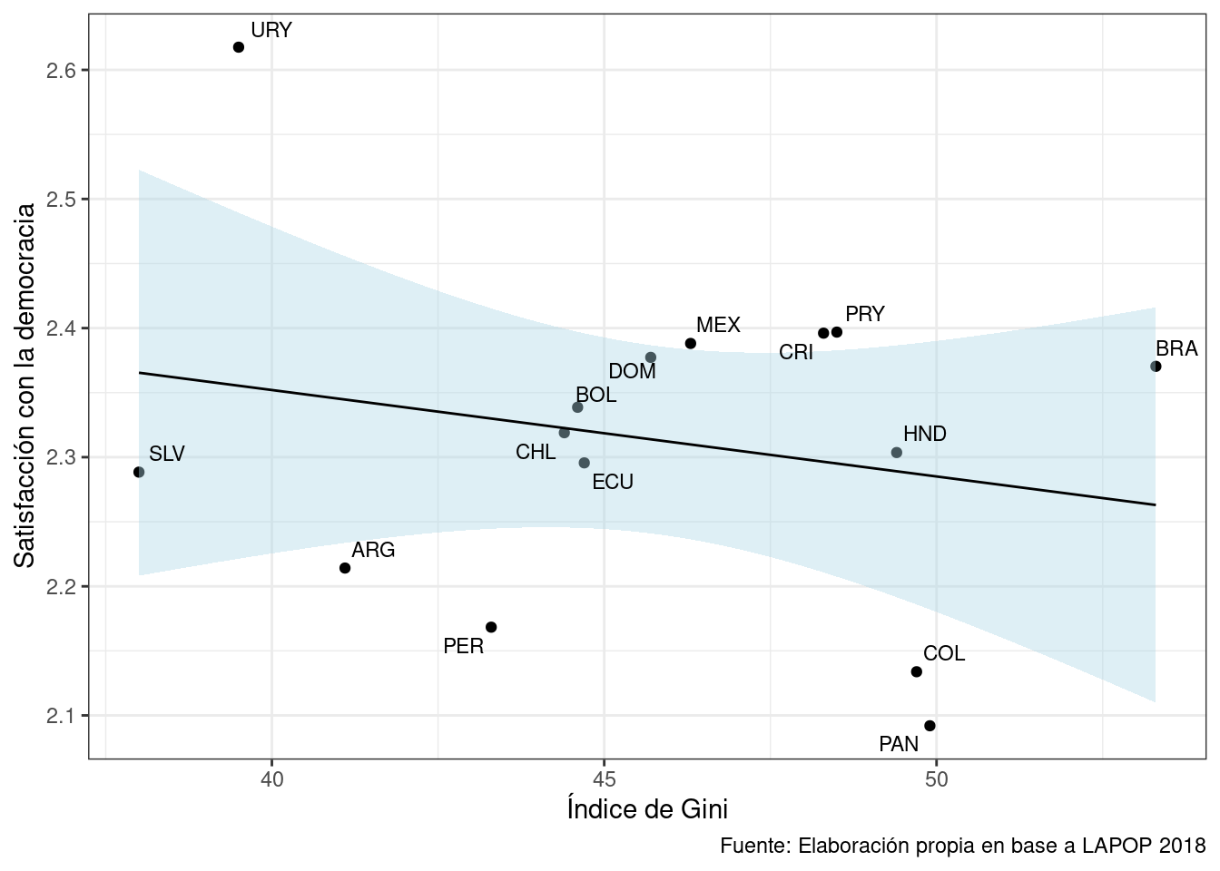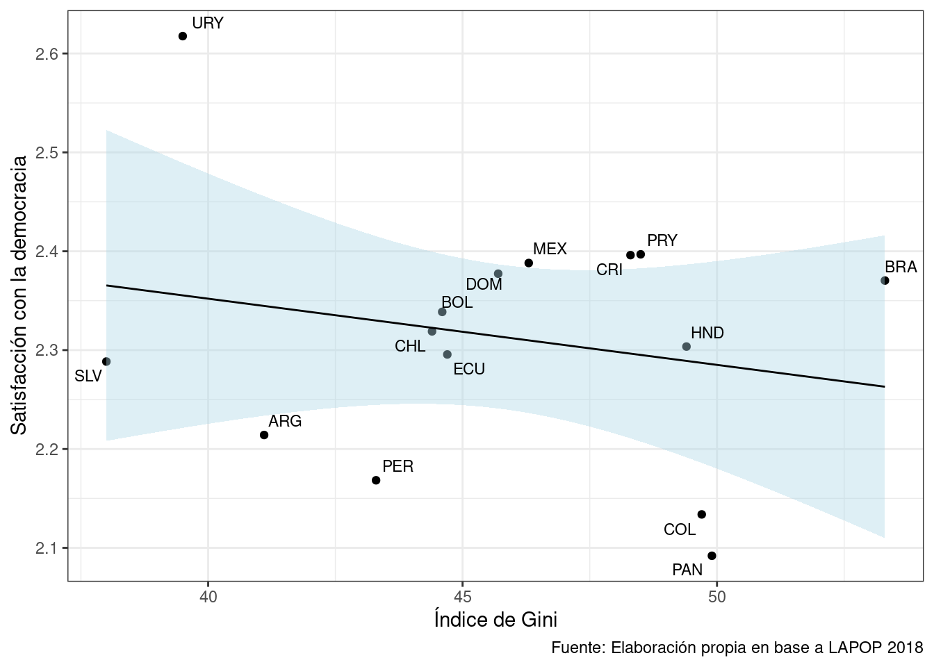 Primero, creamos un objeto llamado g1 en donde almacenaremos la información que queremos graficar. Este objeto tendrá, para cada país, el promedio de satisfacción con la democracia (pn4) y del índice de Gini (gini).