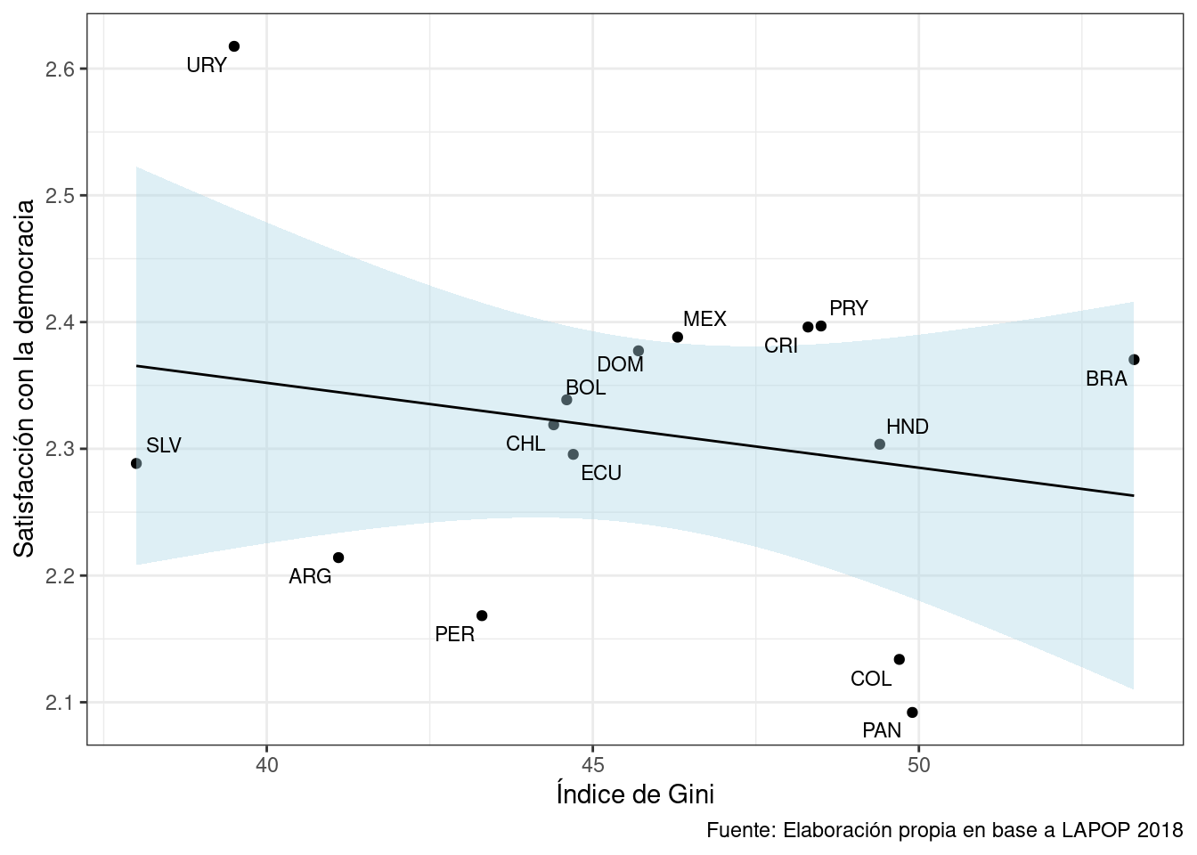 En la Figura 1 se muestra la asociación entre el promedio de satisfacción con la democracía y el nivel de desigualdad ecónomica de los países.