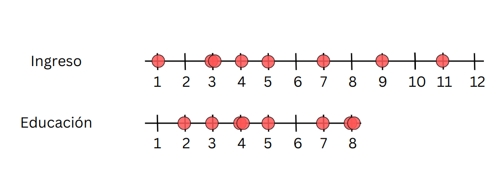 class: front .pull-left-wide[ # Estadística Correlacional] .pull-right-narrow[] ## Asociación, inferencia y reporte ---- .pull-left[ ## Juan Carlos Castillo ## Sociología FACSO - UChile ## 2do Sem 2023 ## [.orange[correlacional.netlify.com]](https://encuestas-sociales.netlify.com) ] .pull-right-narrow[ .center[ .content-block-gray[ ## Sesión 2: # .orange[Bases]] ] ] --- layout: true class: animated, fadeIn --- class: roja # Objetivos de la sesión de hoy <br> ### 1. Recordar y nivelar aprendizajes previos a este curso, fundamentalmente respecto al manejo de datos, medición y varianza ### 2. Introducción a medidas de asociación entre variables --- class: roja right .pull-left-narrow[ # Contenidos ] .pull-right-wide[ ## .yellow[1- Resumen sesión anterior] ## 2- Datos y variables ## 3- Bases: Tendencia central y dispersión ## 4- Midiendo asociación ] --- class: middle .pull-left[ .content-box-red[ .center[ # Imaginación sociológica Relación del individuo con la sociedad y con la historia Individuos en contexto social (C.Wright Mills)] ] ] .pull-right[ .center[ .content-box-green[ # Imaginación estadística Una apreciación de que tan usual o inusual es un evento, circunstancia o comportamiento, en relación con un conjunto mayor de eventos similares (Ritchey, 2008) ] ]] --- class: middle .pull-left[ .content-box-blue[ .center[ # Estadística descriptiva Número de observaciones registradas y frecuencia de esas observaciones (en una muestra o en la población) ] ] ] -- .pull-right[ .center[ .content-box-yellow[ # Estadística inferencial Contraste de hipótesis y teorías científicas en base a datos de investigación ] ]] --- # Sobre el sentido general del curso En este curso vamos a aprender tres cosas principales: 1. **Inferencia**: los resultados que encontramos en nuestra muestra, ¿se encuentran también en la población de la cual proviene la muestra? 2. **Asociación** entre variables: tamaño y significación estadística 3. **Reporte y reproducibilidad** --- class: roja right .pull-left-narrow[ # Contenidos ] .pull-right-wide[ ## 1- Resumen sesión anterior ## 2- .yellow[Datos y variables] ## 3- Bases: Tendencia central y dispersión ## 4- Midiendo asociación ] --- # Datos * Los datos son una expresión numérica de la medición de al menos una .roja[*característica*] de a lo menos una .roja[*unidad*] en a lo menos .roja[*un punto en el tiempo*] -- + Ejemplo: La esperanza de vida en Chile el 2017 fue de 79,9 años - Característica (variable) : esperanza de vida - Unidad: Años - Punto en el tiempo: 2017 --- # Medir .pull-left[ - “asignar números, símbolos o valores a las propiedades de objetos o eventos de acuerdo con reglas” (Stevens, 1951) - Vincula conceptos abstractos con indicadores empíricos ] .pull-right[  ] --- # Medir: requisitos básicos <br> - **Exhaustividad**: el mayor número de categorías significativas. - Ej: ¿Qué categorías se deben considerar para población migrante? - **Exclusividad**: atributos mutuamente excluyentes --- ## Base de Datos * Forma "rectangular" de almacenamiento de datos: .center[] --- ## Base de Datos - cada .blue[fila] representa una unidad o caso (ej: un entrevistad_) - cada .orange[columna] una variable (ej: edad) - cada .purple[variable] posee valores numéricos - los valores numéricos pueden estar asociados a una etiqueta (ej: 1=Mujer) --- ## Ejemplos de estudios / bases de datos 1. [Encuesta Centro de Estudios Públicos](https://www.cepchile.cl/cep/site/edic/base/port/encuestacep.html) 2. [Encuesta CASEN](http://observatorio.ministeriodesarrollosocial.gob.cl/casen-multidimensional/casen/casen_2017.php) 3. [Encuesta Lapop](https://www.vanderbilt.edu/lapop-espanol/) 4. [ELSOC](https://coes.cl/encuesta-panel/) --- # Variables - Una variable representa cualquier cosa o propiedad que varia y a la cuál se le asigna un valor. Es decir: - `\(Variable \neq Constante\)` - Pueden ser visibles o no visibles/latentes. (Ej: peso / inteligencia) --- ## Variables - discretas (Rango finito de valores): - Dicotómicas - Politómicas - continuas: - Rango (teóricamente) infinito de valores. --- ## Escalas de medición de variables - NOIR: Nominal, Ordinal, Intervalar, Razón .small[ | Tipo | Características | Propiedad de números | Ejemplo| |------------ |----------------------------------------------|--------------- |----------- | | *Nominal* | Uso de números en lugar de palabras | Identidad | Nacionalidad | | *Ordinal* | Números se usan para ordenar series | + ranking | Nivel educacional | | *Intervalar* | Intervalos iguales entre números | + igualdad | Temperatura | | *Razón* | Cero real | + aditividad | Distancia | ] ??? - Nominal: Números empleados como etiquetas (ej. sexo, raza) - Ordinales: Distintas categorías puede sen ordenados en serie. Posición, no distancia. (ej. cargos en una empresa) - Intervalares: Escalas de unidades iguales. Diferencia entre dos número consecuntivos refleja diferencia empírica. (ej. Horas del día) - Razón: caracterizados por la presencia de un cero absoluto. (ej. frecuencias de eventos) --- ## Tipos de datos en relación a escalas de medición. * **Datos categóricos**: - pueden ser medidos sólo mediante escalas nominales, u ordinales en caso de orden de rango * **Datos continuos**: - Medidos en escalas intervalares o de razón - Pueden ser transformados a datos categóricos ??? Conversión de continuo a categórico: estatura (cm) a categorías bajo – mediano – alto --- ## Descriptivos según tipo de variable <br> .small[ | | Categórica | Continua | Categ.(y)/Categ.(x) | Cont.(y)/Categ.(x) | |------------- |--------------------------------- |------------------------- |------------------------------------------------ |------------------------------------------ | | **Ejemplo** | **Estatus Ocupacional** | **Ingreso** | **Estatus Ocupacional (Y) / Género (X)** | **Ingreso (Y) / Género (X)** | | Tabla | Frecuencias / porcentajes | `\(\bar{X}\)`/sd ... o recodificar en categoría